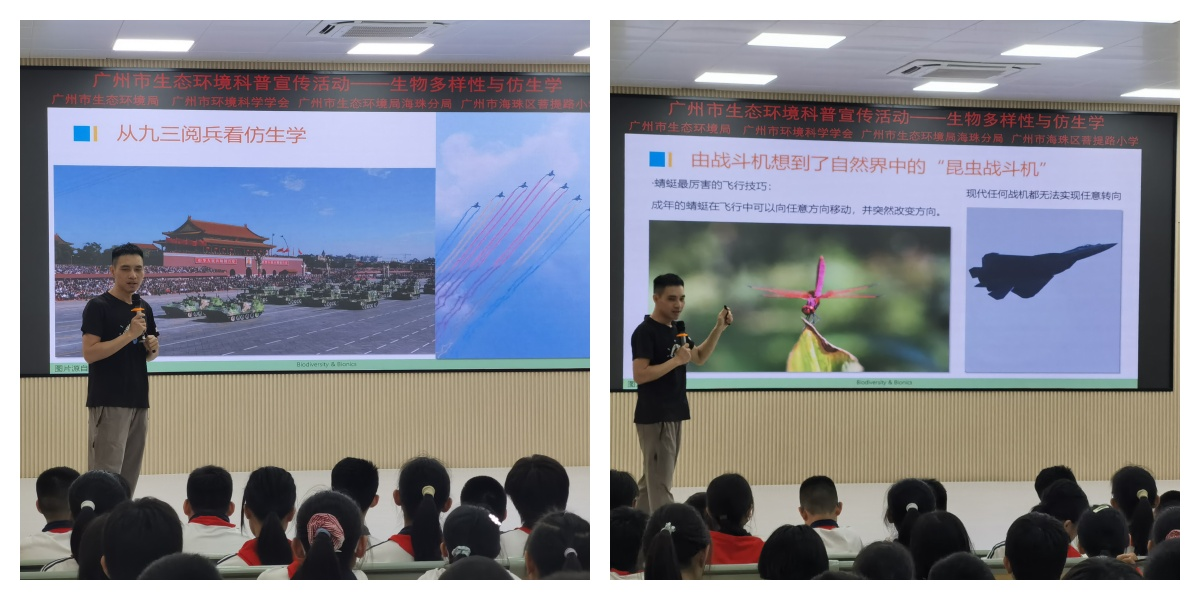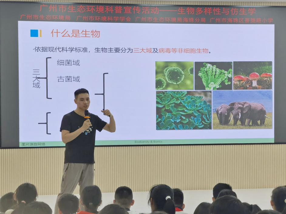 今年9月是全国科普月,由市生态环境局主办、市环境科学学会和市生态环境局海珠分局共同承办的2025年全国科普月系列活动之生态环境科普宣传活动,于9月22日上午,邀请世界自然基金会的杨老师走进了海珠区菩提路小学,为该校六年级268名学生带来题为“生物多样性与仿生学”生态环境科普讲座,带领学生进行了一场从军事科技到自然奥秘的跨界探索。