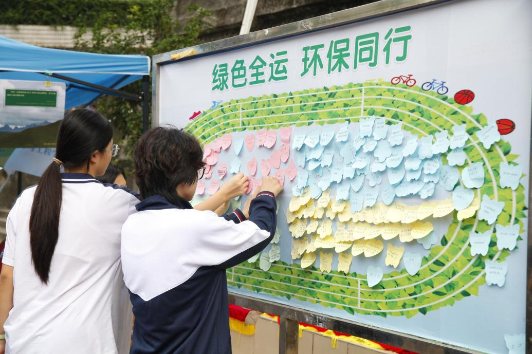 活动在激昂的环保歌曲《让中国更美丽》中拉开帷幕。学生们有序在“低碳全运 环保有我”主题留言墙上粘贴自己的环保行动承诺,以行动支持美丽全运。随后,主持人介绍活动背景及嘉宾,强调本次活动旨在通过校园接力形式,推动低碳理念深入青少年群体。