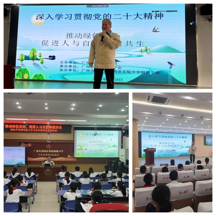 为了让青少年更好地学习二十大的生态文明理念,提升他们对绿色低碳意识和社会责任,由市生态环境局指导,市环境科学学会在1月15日下午、17日上午、18 日下午,分别来到海珠区梅园西路小学、广州市五中东晓学校和海珠区外国语实验中学附属学校开展了以“推动绿色发展 促进人与自然和谐共生”为主题的生态环境科普讲座。讲座以线上+线下形式相结合,其中线下444人,线上1349人。